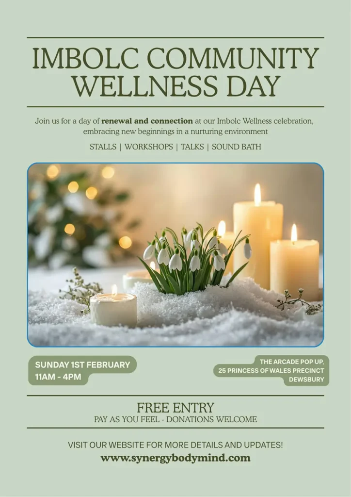 On Sunday, 1st February, Synergy Body & Mind invites you to The Arcade Pop Up in Dewsbury for a special Imbolc Community Wellness Day. This is more than just an event; it is a gathering designed to foster renewal, connection, and a sense of nurturing as we step into a brand-new season.
